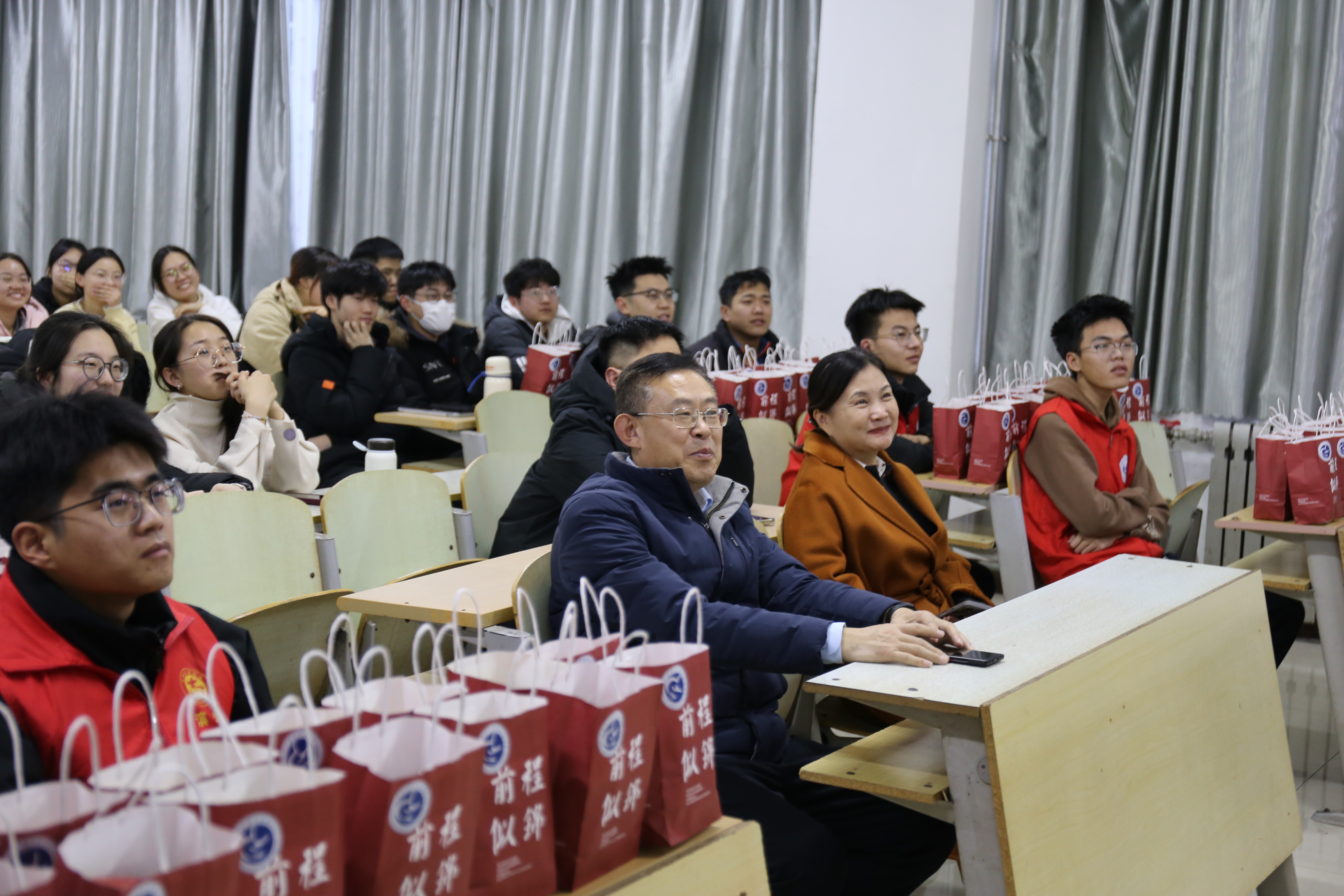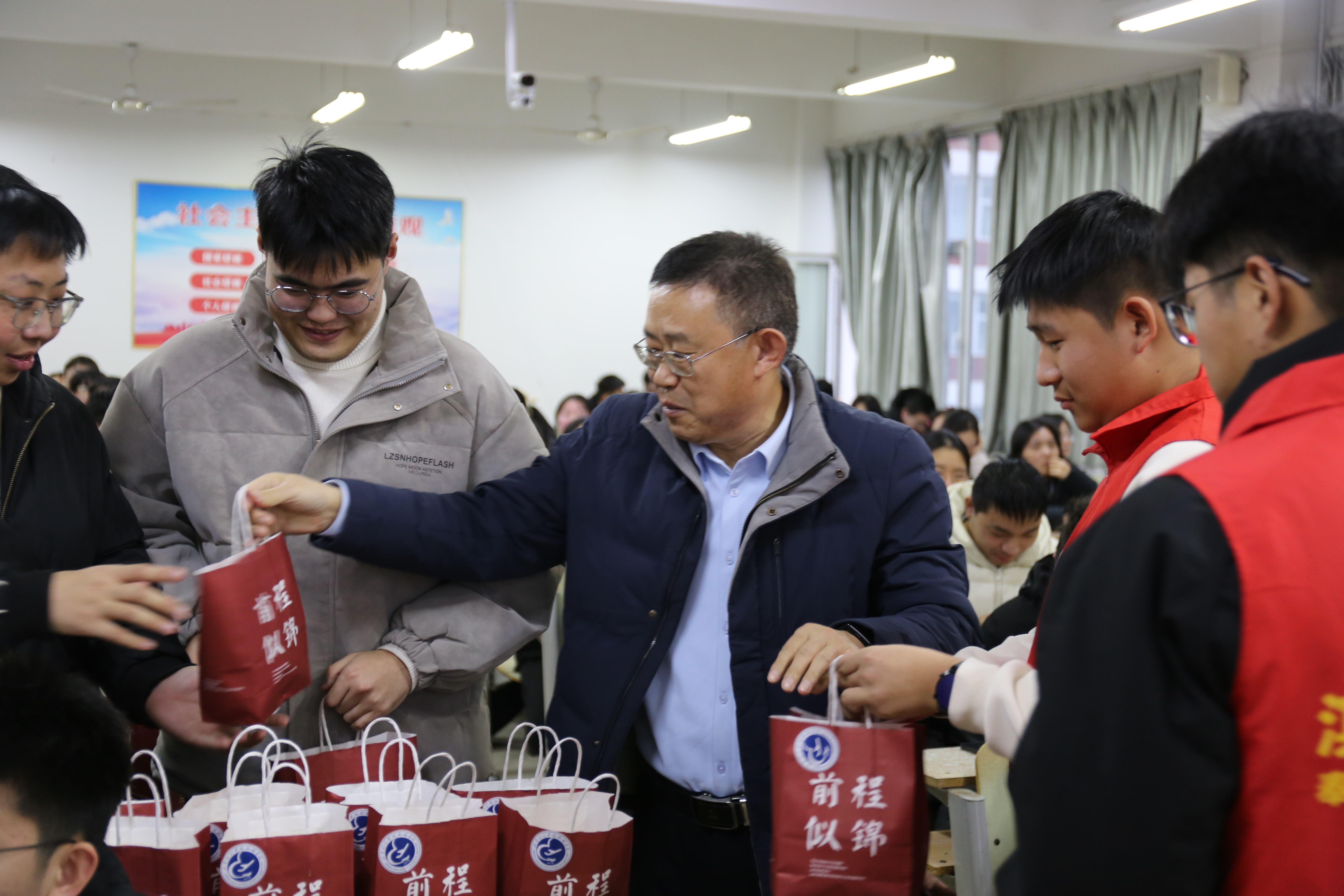 会上,王珊珊围绕考研考前准备展开细致讲解,明确列出准考证、身份证等必备证件及2B铅笔、橡皮等文具清单,着重强调考试纪律,严令杜绝作弊行为,要求全体学子坚守诚信应考底线。同时,她还详细介绍了学院的考研志愿服务安排,包括学院组织的服务团队、考点周边的志愿服务点位置、考前引导与物品暂存等服务内容,以及急救包、备用文具等应急物资配备,让学子们对考前保障心中有数。随后,在校生师弟师妹以及顺利考取研究生的师哥师姐通过视频的形式,为即将考研的同学们送上诚挚祝福。视频里,他们用充满朝气的声音喊出加油口号,一幕幕温暖画面,充分彰显了学院团结一心、互帮互助的良好氛围。党委书记、院长、副书记以及班主任老师们代表学院为学子们送上上岸加油包,希望大家怀揣“黄沙百战穿金甲,不破楼兰终不还”的坚毅决心,在考研征程中勇克难关、勇往直前。全院师生的祝福与关怀,温暖了每一位学子的心田,也让大家感受到了学院的殷切期望与有力支持。
